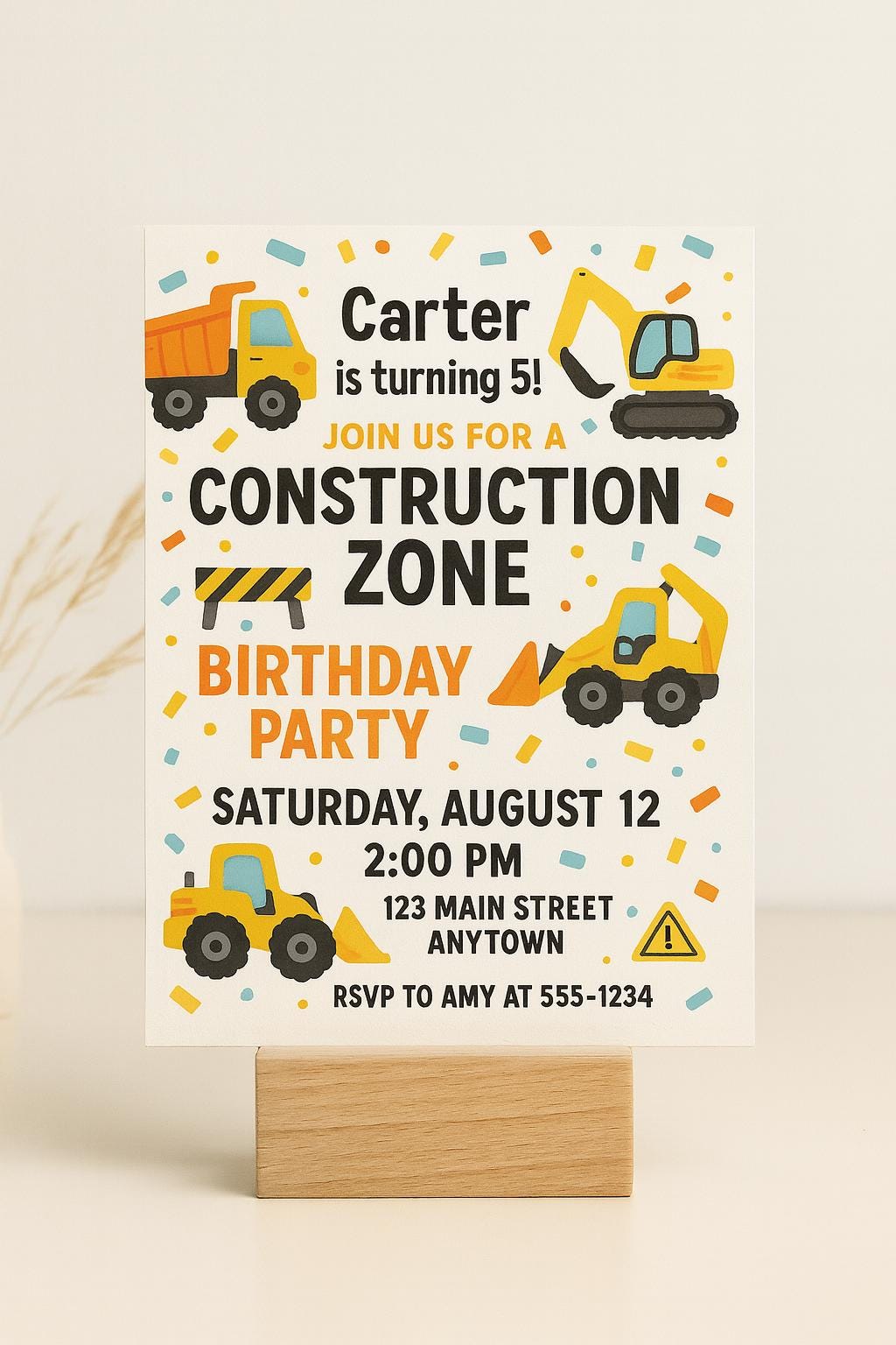 This bold Construction Zone Birthday Invitation features bright yellow diggers, dump trucks, traffic cones, and confetti — perfect for little builders who love trucks and construction sites.