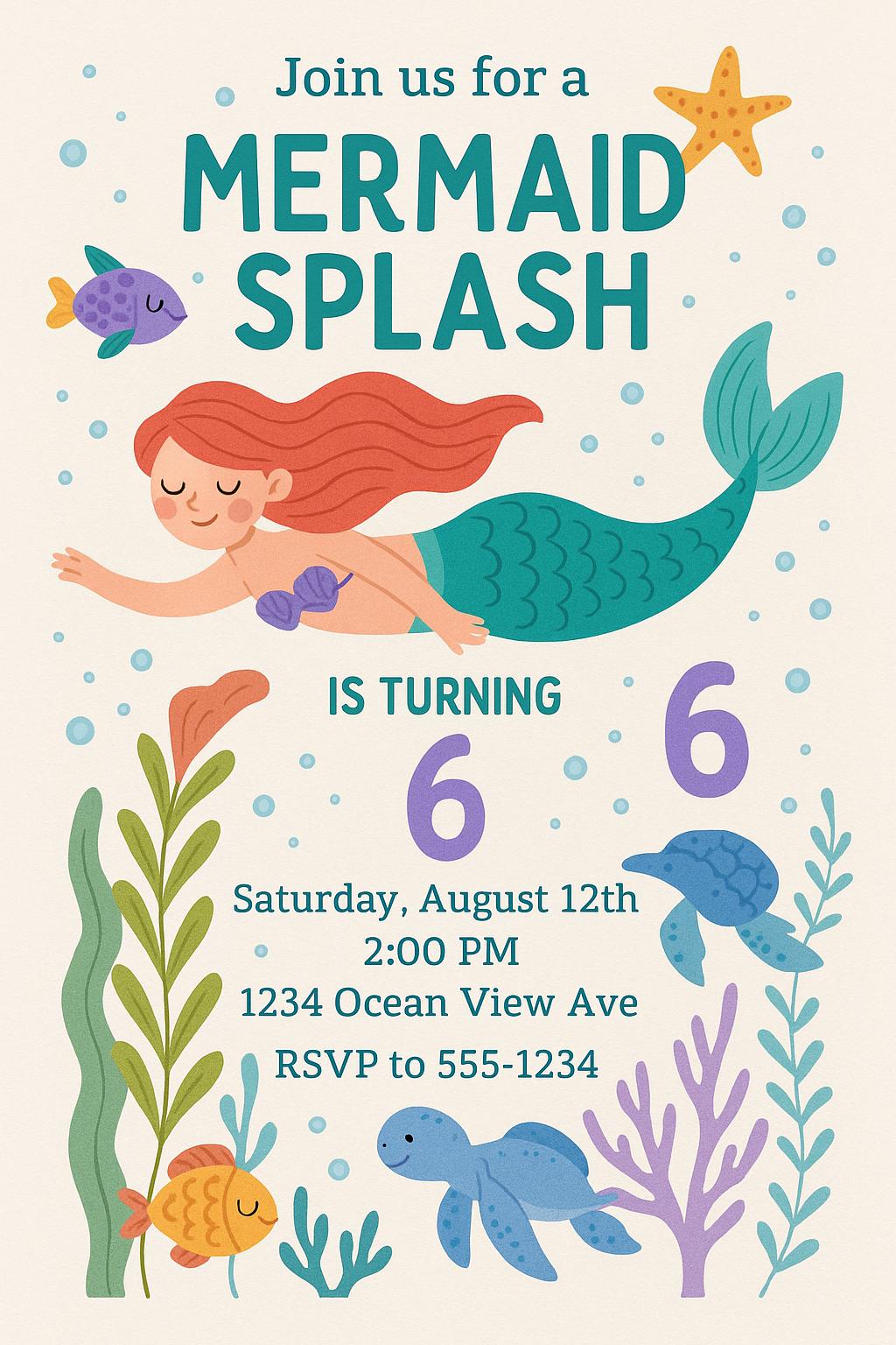 This adorable under-the-sea themed invitation features a sweet mermaid, sea turtles, colourful fish, and ocean plants — perfect for a magical mermaid or splash-themed birthday party.
